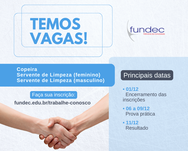 A Fundação Dracenense de Educação e Cultura (Fundec) está com inscrições abertas para contratação de Copeira, Servente de Limpeza (feminino) e Serv ...