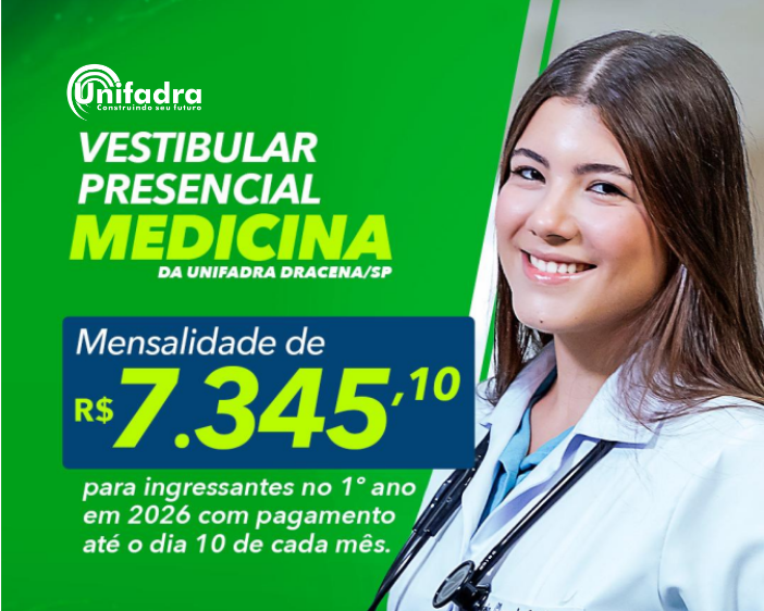 Estão abertas, até o dia 6 de novembro, as inscrições para o Vestibular de Medicina da Unifadra Dracena. A prova será presencial, no dia 30 de novembro, às 14h, na Unifadra (Rua Bahia, 266 – Metrópole – Dracena/SP).