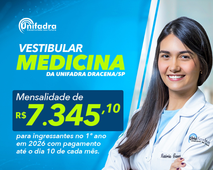 A Unifadra Dracena (SP) está com inscrições abertas para o vestibular de Medicina pela nota do Enem. Os candidatos podem participar utilizando exclusivamente a nota do Exame Nacional do Ensino Médio, válida a partir de 2015. As inscrições podem ser feitas até 12 de novembro de 2025 neste link .