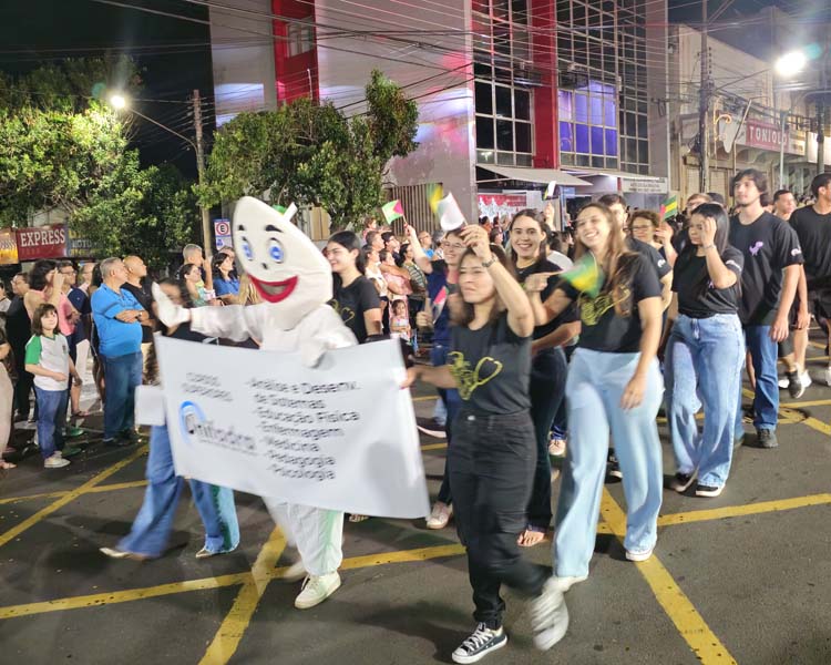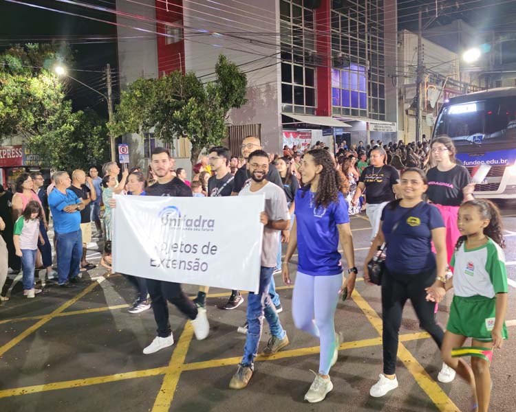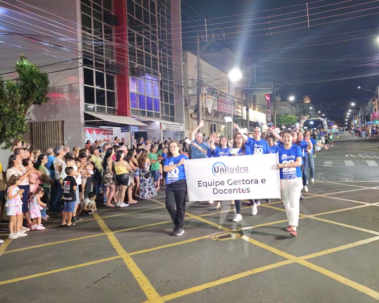 Representando os cursos superiores, docentes, equipe gestora e alunos de todos os cursos da Unifadra participaram do desfile: Análise e Desenvolvimento de Sistemas, Educação Física, Enfermagem, Pedagogia, Psicologia e Medicina. O ônibus utilizado pelos estudantes integrou a apresentação, reforçando a identidade acadêmica da instituição e a abrangência de sua atuação.