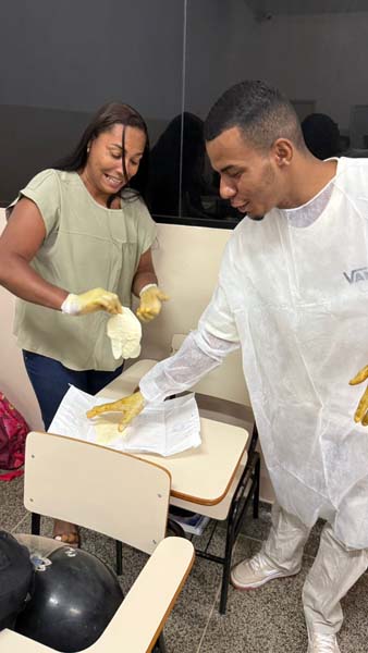 A proposta permitiu identificar como o contato direto e indireto favorece a disseminação de agentes infecciosos, promovendo uma discussão coletiva sobre riscos e medidas de prevenção. Na sequência, os estudantes participaram da demonstração e prática de técnicas essenciais de biossegurança, com ênfase na higienização correta das mãos e na técnica adequada de calçar luvas estéreis.