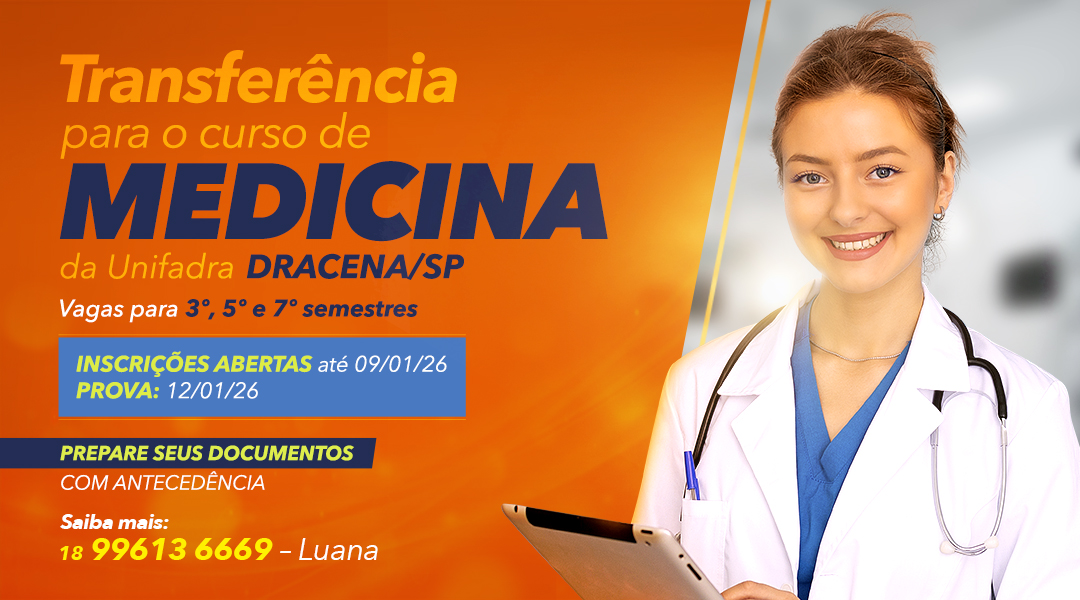 A Unifadra Dracena, mantida pela Fundação Dracenense de Educação e Cultura (Fundec), publicou o edital do processo de transferência para o curso de Medicina. As inscrições estão abertas até 09/01/2026, pelo site: fundec.edu.br/unifadra/transferenciamedicina .